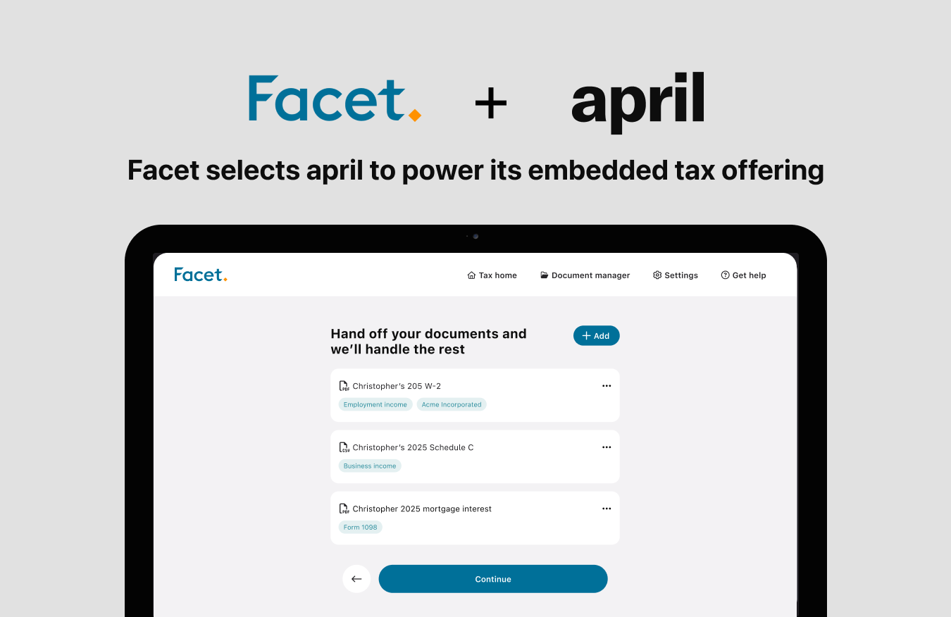 april is the only 100% native, nationwide, and licensed AI tax engine built to be embedded. It’s a natural fit with Facet’s platform which already includes services for retirement, education, estate, and career planning.