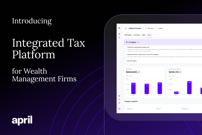 The Integrated Tax Platform was built atop april’s nationwide tax coverage and trusted AI-powered tax engine, and originally created to help financial advisors stay in the loop while offering clients a fully managed, hands-off tax filing experience in which april’s U.S.-based, credentialed tax professionals prepare and file the return.